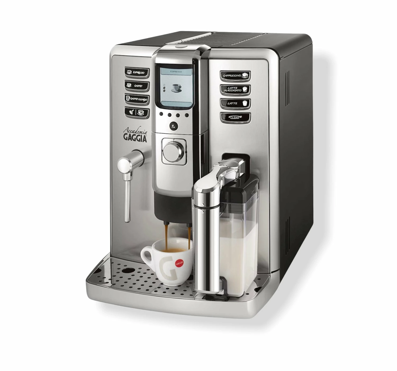The Gaggia Accademia provides a true pro-barista experience allowing users to adjust the flow of extraction and control milk frothiness, it comes with seven customizable drinks, all easily accessible on the face of the machine.